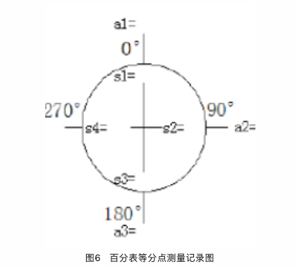 5、測量與記錄:測量時,先測0° 方位的徑向讀數(shù)a1及軸向讀數(shù)s1。為了分析計算方便,常把a(bǔ)1和s1調(diào)整為零,然后兩半聯(lián)軸器同時轉(zhuǎn)動,每轉(zhuǎn)90°讀一次表中數(shù)值,并把讀數(shù)值填到記錄圖中。圓外記錄徑向讀數(shù)a1、a2、a3、a4,圓內(nèi)記錄軸向讀數(shù)s1、s2、s3、s4。當(dāng)百分表轉(zhuǎn)回到零位時,必須與原零位讀數(shù)一致,否則需找出原因并排除之。