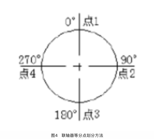 2、等分線劃分:將靜態(tài)下的兩半聯(lián)軸器在0°~360°之間平分四等分,并在等分點做好畫線標(biāo)記,如圖4所示。
