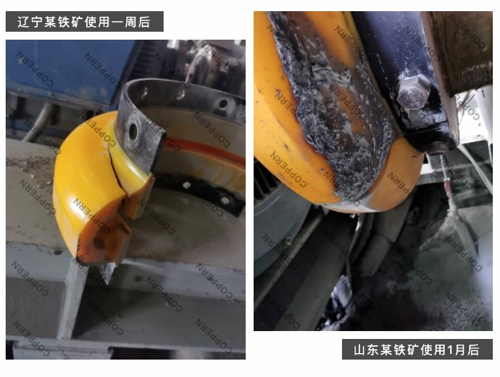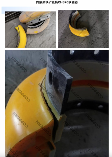 以CH870單缸圓錐破碎機(jī)為例,其設(shè)計為直傳動,軸對中精度高,旋轉(zhuǎn)支承部位振動小、溫升低、磨損小、破碎機(jī)故障率低;軸對中精度低,旋轉(zhuǎn)支承部位振動加劇、溫升高、磨損加快、破碎機(jī)故障率高,甚至?xí)斐伤捷S斷裂等事故??梢哉f,安裝聯(lián)軸器時軸對中精度的高低對破碎機(jī)運行周期及運行效率有著直接的影響。以下照片為CH870聯(lián)軸器在實際安裝因軸對中較差造成聯(lián)軸器高溫老化、撕裂的問題。