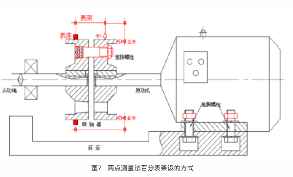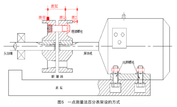 3、百分表架設(shè):在主機(jī)側(cè)半聯(lián)軸器上裝上專用夾具及百分表,使百分表的觸頭指向電機(jī)側(cè)半聯(lián)軸器的外圓及端面,架設(shè)方法如下圖5所示。